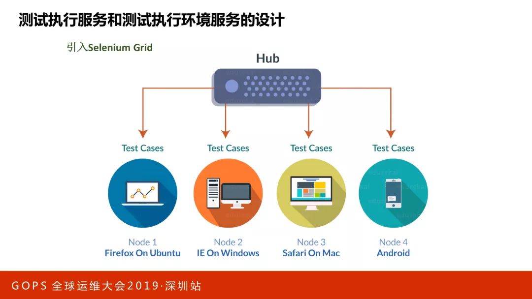 有什么好的方法来解决?我们引入了Selenium Grid。大家不要把Selenium Grid想象得很复杂,如果时间充裕我们可以在现场机器搭建Grid环境,不超过五分钟就可以把这个环境搭建起来。它是类似于一个二层的树状结构,根接点我们称为Hub,下面的叶子节点我们称为Node,节点可以挂不同浏览器和操作系统的组合。