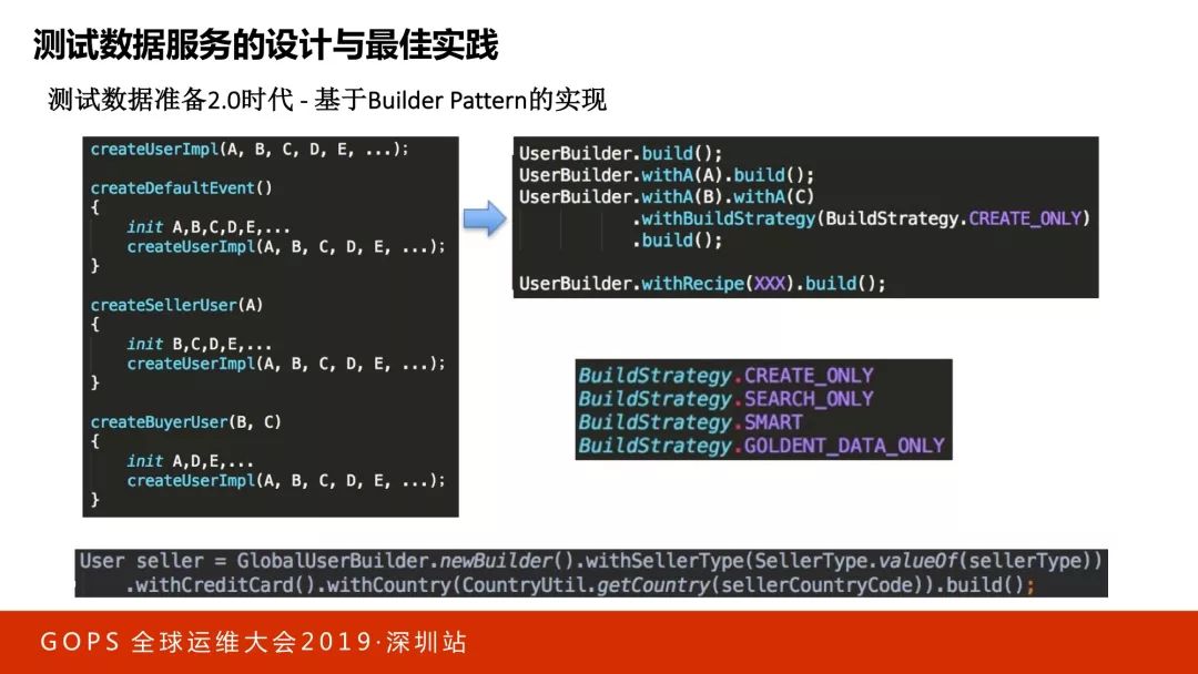 为此,我们在此基础上又做了改良。当我需要一个user,我们引入了Builder模式,当需要指定一个属性而其他属性可以采用默认值的时候,with这个参数值就可以了。如果需要两个参数修改,就是with两个参数就可以了。其他没有被制定的参数就会直接使用默认值。这样,不管测试数据多复杂,都可以用一行代码调用来生成测试数据。这就是2.0时代。