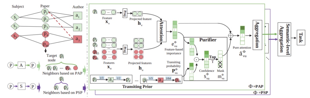 至此,这种方法增强了节点级注意,编码了元路径邻居的转移概率,只聚合top- 的可靠邻居,缓解了扰动扩大和软注意机制问题。最后,最终的被纯化的注意力值 将用于聚合邻居以实现特定语义的嵌入 :