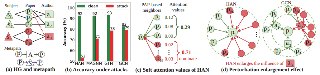 图1:ACM数据集上针对HGNNs的对抗攻击的示例。(a) 异质图(HG)和元路径 (metapath)的基本概念。(b) HGNNs和GCN的鲁棒性测试。(c)对抗边 下HAN中 的软注意值的toy example。(d)对抗边 对HAN和GCN的影响比较。