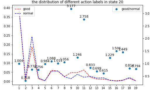 分析数据中客户说的话所处的状态的分布为:将保存下来的模型分别用于优秀经纪人和一般经纪人对话中客户说话状态的预测,分析相同状态下,优秀经纪人和一般经纪人给出的动作的差异。下图表示在客户状态为20时,优秀经纪人和一般经纪人做出的19种动作的分布: