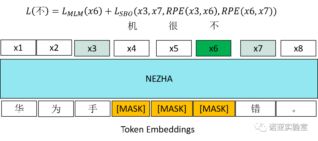 此外,借鉴SpanBERT ,NEZHA模型还引入了Span预测任务,该任务Mask一个连续的Span(例如下图中“机”,“很”,“不”三个字),利用Span前后的两个字的最上层表示(下图中的x3和x7)以及待预测字的位置信息来预测该字,如下图中,待预测字为“不”,Span预测任务会使用x3,x7和“不“”这个字的位置信息(就是x3和x6还有x6和x7之间的相对位置编码)来预测该字,“机”和“很”的预测也是同样的方法。该方法使得Span前后的字的表示会包含Span中字的语义信息,由于在训练过程中,一个句子会被随机Mask很多次,所以句子中每个字都有机会成为Span的前后字,进而使得各个字学到的表示都会包含周围Span的信息,Span预测任务能够有效提高模型在下游的Span抽取任务(此任务的目标是获取一段文字中目标片段的开始和结束位置)的效果。