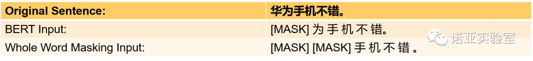 预训练任务:本工作引入了全词Mask技术,即不同于原始的BERT模型Mask单个中文字,该技术在MLM预训练任务中Mask整个词而不是单个字(如下图全词Mask方法Mask了一整个词“华为”),进而提升了任务难度使得BERT学到更多语义信息。