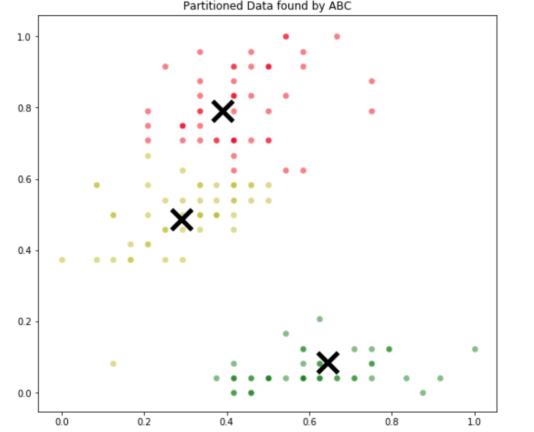 如何修改原始的 ABC 算法使其得以执行聚类任务?实际上,此处 ABC 算法没作任何改动。唯一要做的就是将聚类问题转化为优化问题。如何做到这一点?