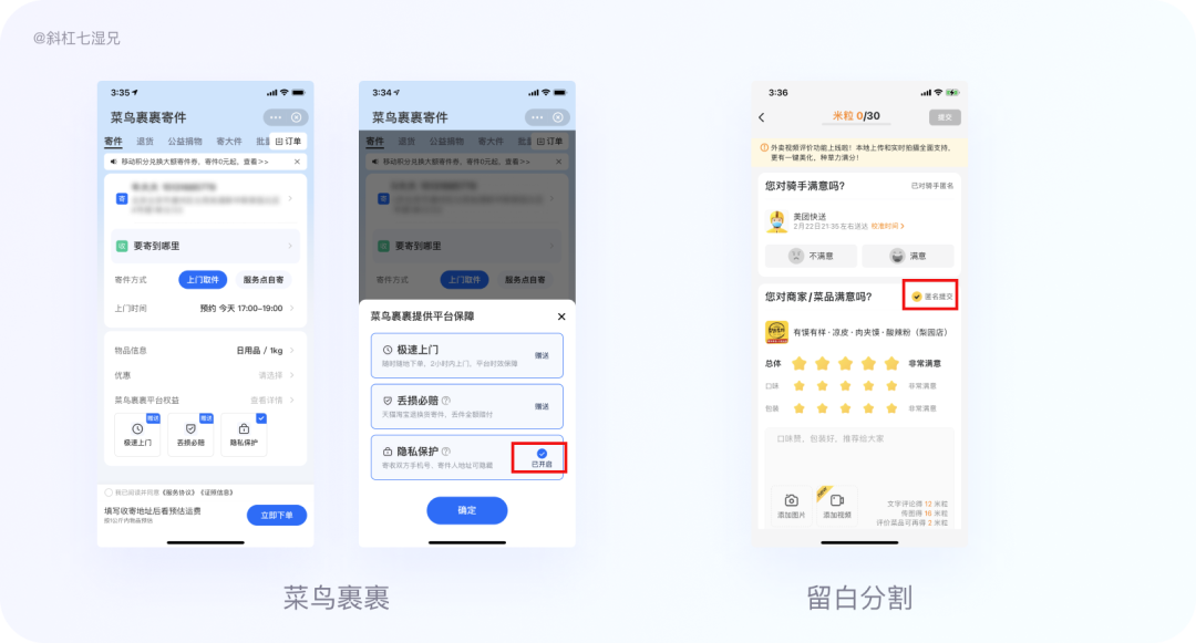 比如,菜鸟裹裹上线“线上隐私寄件”的信息保护功能,在发货界面开启「隐私寄件」后,用户的信息将会在包裹面单上进行脱敏处理,只展示部分地址信息,这很好解决了用户对隐私安全的顾虑。