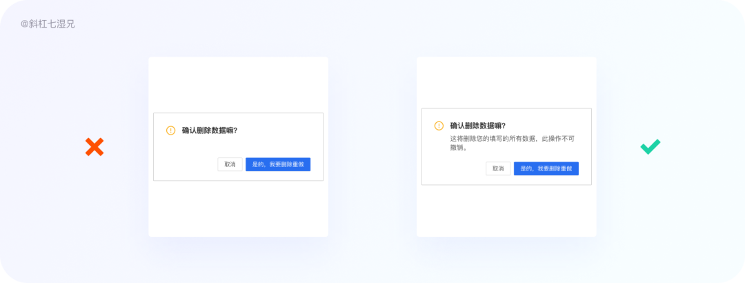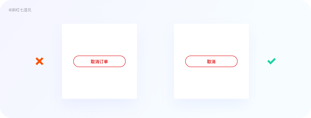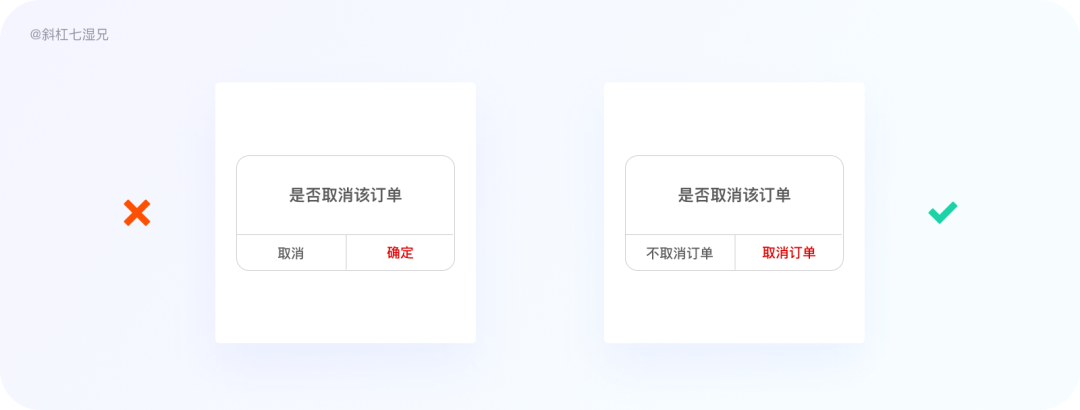 比如下面这个案例,我不可否认左面的案例看起来更加有效率,但是文案过于简单会引起用户的异议,因为“取消”在这个场景下也代表取消订单的意思,所以在简洁的同时,清晰、准确地传达信息更加重要。