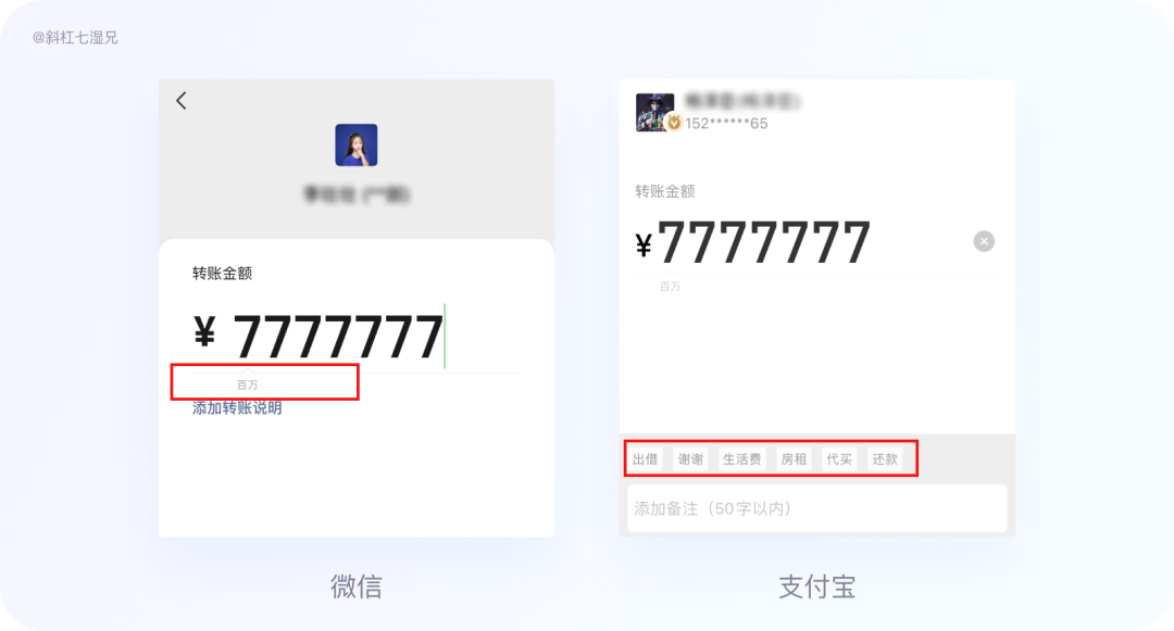 大部分用户都不喜欢计算或者投入很多脑力活动,更希望的是产品整体的操作流程是简单、高效的,并且在简单、高效地体验同时,还能保证产品的准确性,尤其是数字类场景,不会因为自己的理解错误,带来意外的财产损失,我最近体验微信和支付宝就发现了下面两个功能点的差别。