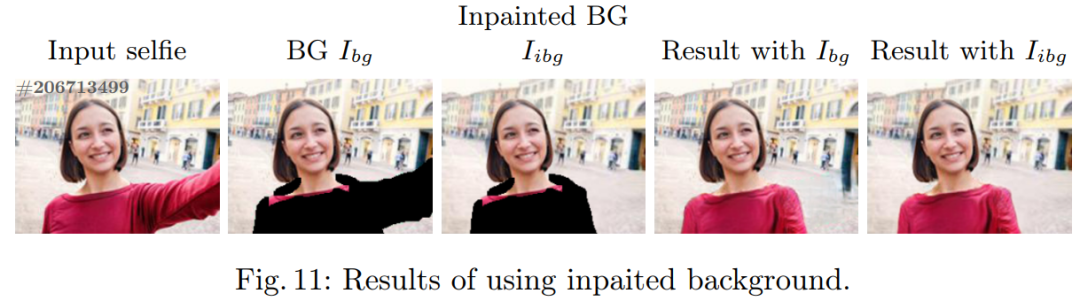此外,图 10 示例也暴露出了背景合成的局限。不过,针对此问题,研究者在下图 11 中也展示了利用已有模型对图像背景进行修复的示例,从而证明了在大规模数据集上训练的图像修复模型的好处。