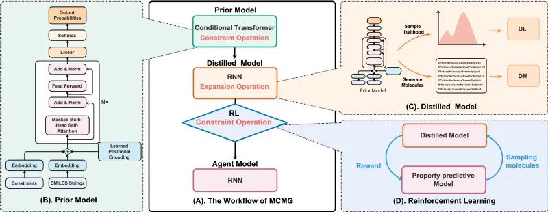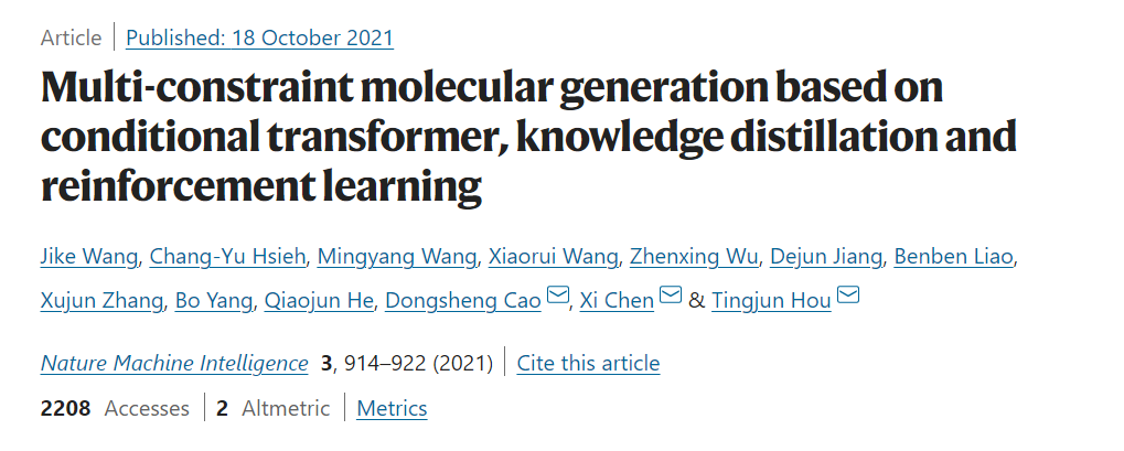浙江大学智能创新药物研究院&药学院侯廷军教授团队、武汉大学陈曦团队、中南大学曹东升团队和腾讯量子实验室联合在《自然·机器智能》(Nature Machine Intelligence)发表论文“Multi-constraint molecular generation based on conditional transformer, knowledge distillation and reinforcement learning”,提出了一种多约束分子生成新方法MCMG,该方法可以高效地遍历复杂的化学空间以寻找满足多种性质约束的新型化合物,为先导结构的发现提供了功能强大的计算工具。