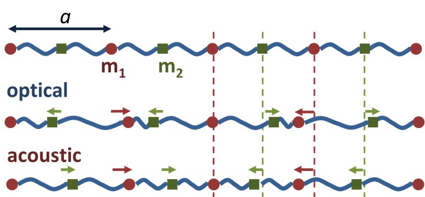 固体由若干原子(原子实与电子)按一定方式组合而成,这些粒子相互作用,形成一个巨大的多粒子系统。固体晶格振动的简正模能量量子被称为声子。离子晶体中正负离子相对振动形成长光学波,质心的振动形成长声学波。| 图片来源:维基百科