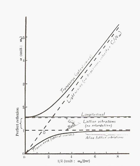 光波与晶格振动,参见 Born & Huang 原著。图中两条水平的虚直线表示(上)纵向光学声子LO和(下)横向光学声子TO的色散关系。在这两条线之间不存在极化激元,光波几乎完全被离子晶体反射,这也就是所谓的剩余射线带。斜的虚直线表示光子的色散关系。两条实曲线表示极化激元的色散关系。在横向光学声子TO与光子的色散曲线相交的点附近,光子与声子形成共振,发生强烈的耦合。