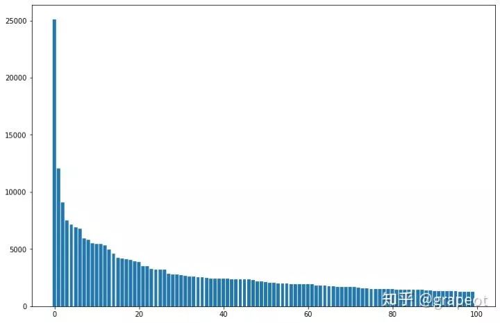 最终得到一个97万张图,7万个角色的数据集。平均每个角色有13.85张图像。但和大多数数据集一样,每个角色有多少张图像是个非常长尾的分布。在7万个角色中,有2万个角色只有一张图片。如果我们把图像最多的100个角色画一个直方图的话,长这样:
