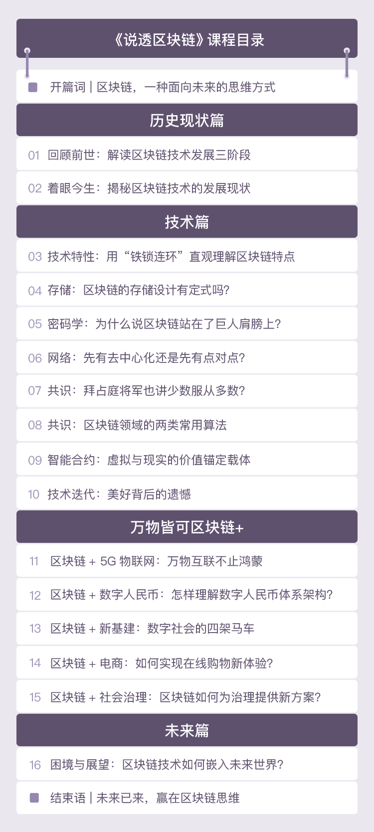 除了深入讲解区块链的底层逻辑,揭秘区块链技术发展三阶段,还能让你洞悉区块链商机的思维方法,了解区块链 + 应用的五大热门方向。都是非常实用的干货,带你少走弯路,快速入门区块链,并学为己用,在各自领域大显身手。