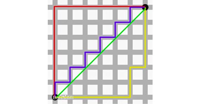 图中红线代表曼哈顿距离,绿色代表欧氏距离,也就是直线距离,而蓝色和黄色代表等价的曼哈顿距离。