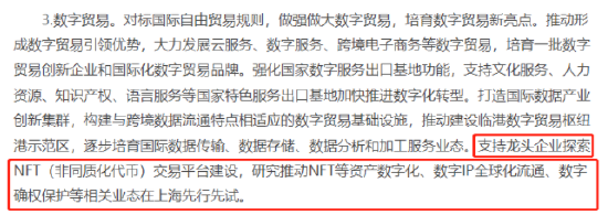 7 月 14 日,据北京商报消息,近期上海市人民政府办公厅发布《上海市数字经济发展“十四五”规划》(以下简称《规划》)。在《规划》“拓展数字新产业”板块中,提出支持龙头企业探索 NFT 交易平台建设,研究推动 NFT 等资产数字化、数字 IP 全球化流通、数字确权保护等相关业态在上海先行先试。