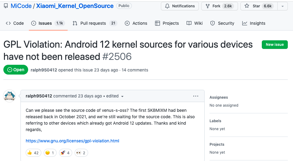 一名开发者在 MiCode/Xiaomi_Kernel_OpenSource 上提了一个“违反 GPL 协议”的 issue:“我们可以看到 venus-s-oss 的源代码吗?第一个 SKBMIXM 已经在 2021 年 10 月发布,我们仍然在等待源代码,包括其他已经得到 Android 12 更新的设备。”