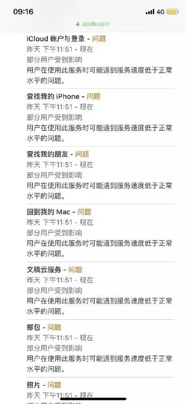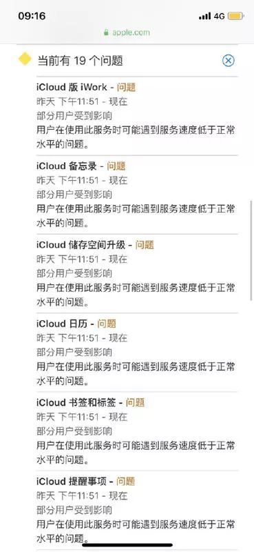 在苹果的系统状态页面中,苹果也注意到 iCloud 发生了广泛的服务中断,但苹果提示并不是每个人的手机都会受到影响。