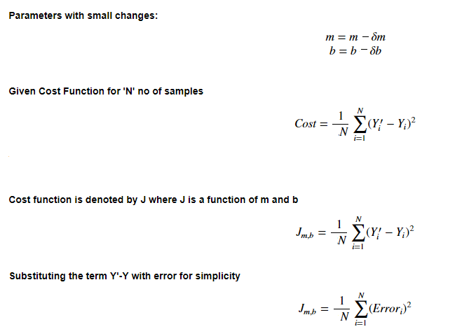 现在,让我们将上面介绍的一切写成数学公式。在等式 y = mX+b 中,m 和 b 是其参数。在训练过程中,它们的值会进行较小的变化。我们将这个小变化表示成δ。参数的值将分别以m=m-δm和 b=b-δb 的方式更新。这里我们的目标是找到y=mx+b 中能使误差最小的 m 和 b 值,即最小化成本函数的值。