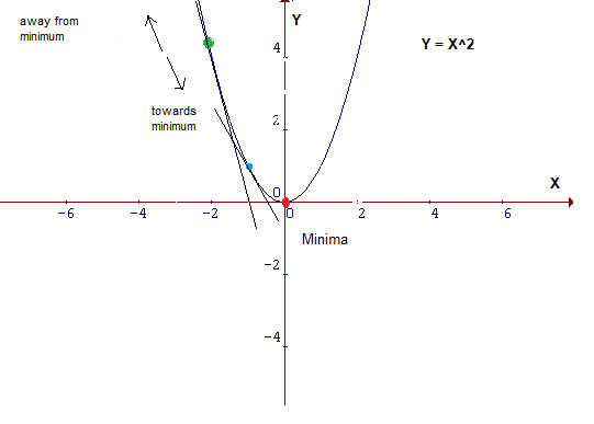 在上图中,我们可以在绿点画一条切线,我们知道,如果我们向上移动,我们就将远离最小值或者反过来。另外,这条切线也能让我们了解斜率的陡峭程度。