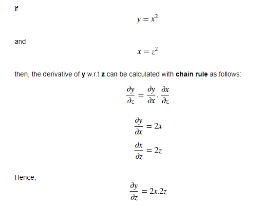 如果变量 z 依赖于变量 y,而变量 y 又依赖于变量 x,则 y 和 z 是因变量,而且 z 也通过中间变量依赖于 x。这被称为链式法则,用数学式可写成: