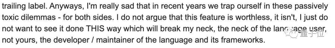 我不是说这个特性毫无价值,但我不想它被引入成语法糖,这会“折断语言使用者的脖子”。