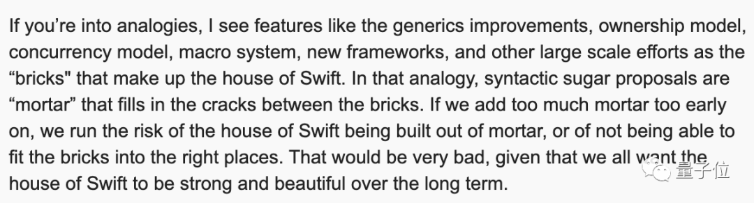 随后,他引用了Lattner本人很早以前就发表的一段关于语法糖的思考。