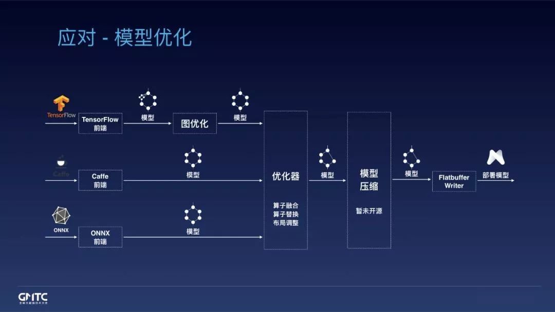 在模型优化中,MNN 引入了前端的概念来统一训练框架。不同的前端负责加载不同训练框架的模型,统一转换为 MNN 的模型格式。对于最常用的训练框架 TensorFlow 和 Caffe ,我们提供了独立的前端;其他训练框架,比如 MXNet ,则需要先将模型转换为 ONNX ,再通过 ONNX 前端加载。这里,由于 TensorFlow 的算子颗粒度相比 Caffe 和 ONNX 要更小,我们引入了图优化的模块来对齐算子之间的颗粒度。模型转换之后,会经过优化器优化,包含算子融合、算子替换、布局调整等等。之后,可以选择对浮点模型执行量化压缩。目前模型压缩的模块还没有开源,我们会在完善之后,将相关代码开源。这些步骤都完成之后,会使用 flatbuffer 来保存部署模型。