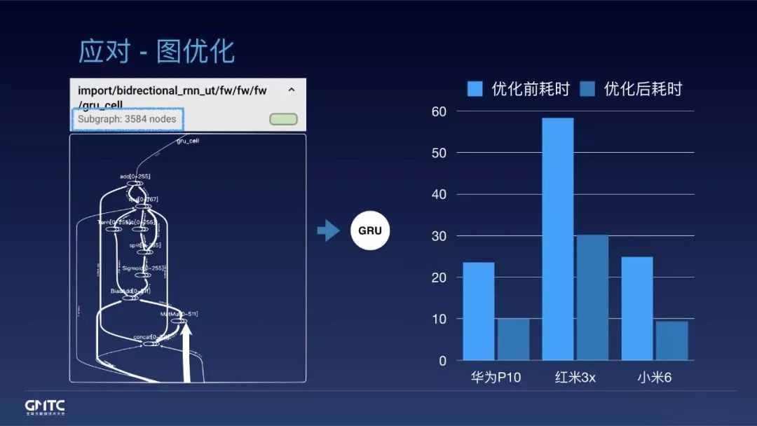 右图展示的是一个实际业务模型在图优化前后的性能对比。在华为 P10 、红米 3x 、小米 6 上都有 1 倍左右的性能提升。而如果是双向 GRU ,效果还会更明显。