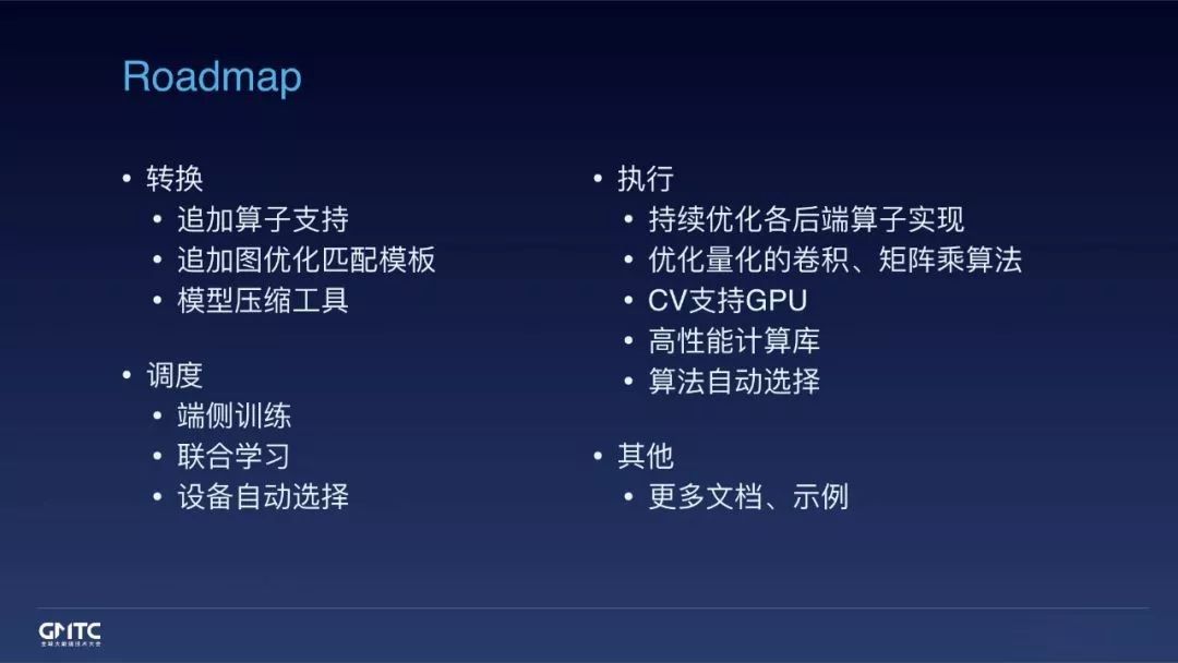 在后续计划上,转换部分,我们计划追加更多算子和更多图优化匹配模板,也计划将模型量化工具开源;调度部分,我们计划分步实现端侧训练和边缘学习,计算设备自动选择也在筹划中;执行部分,还是会持续优化现有各端算子的实现,也计划优化量化卷积、矩阵乘算法,计划在 CV 库上直接支持 GPU ,我们也考虑将现有 NC/4HW4 实现的算法,整理为独立的高性能计算库,算法自动选择同样在筹划中;其他部分,我们会持续建设项目的可用性,持续加入更多的文档和示例。