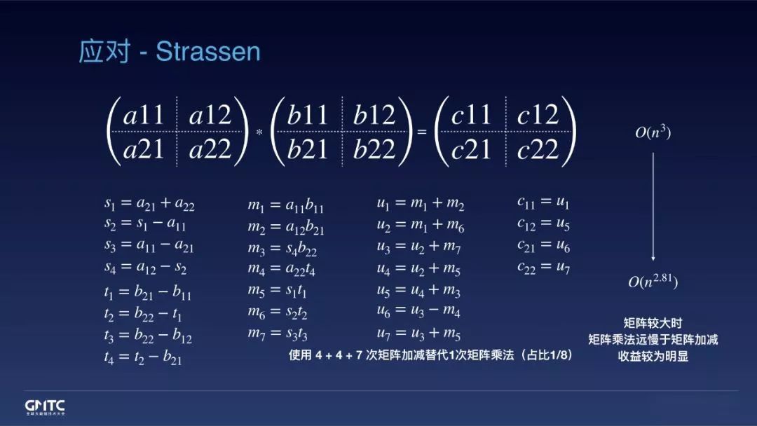 这里可以引入中间小矩阵, s1 ~ s4、t1 ~ t4、m1 ~ m7、u1 ~ u7 。其中,只有 m1 ~ m7 包含小矩阵乘法,一共 7 次小矩阵乘法运算。而其他的,只包含小矩阵的加减法。也就是说,通过 4 + 4 + 7 次小矩阵加减法,替代了一次小矩阵乘法。