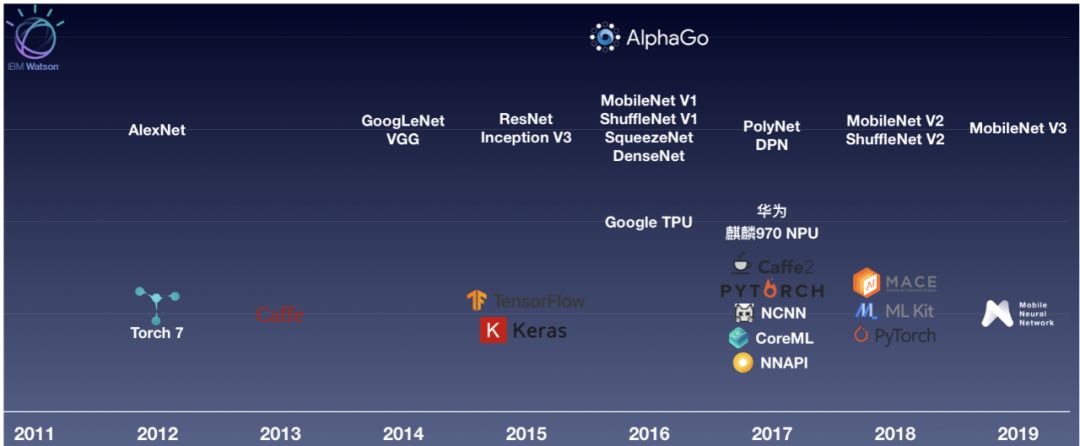 人工智能从 2006 年开始,迎来了第三次浪潮。随着 AlphaGo 在 2016 年、 2017 年先后战胜李世石和柯洁,人工智能彻底进入了公众的视野。人工智能大热的背后,是大数据的积累,是深度学习的发展,也是设备算力的提升。与此同时,深度学习的框架也在不断演进 —— 从 Torch、Caffe 到 TensorFlow、PyTorch ,再到更面向移动端的 CoreML、NNAPI、NCNN、MACE 等。淘宝的深度学习推理引擎 MNN 也于 2019 年 5 月宣布开源。