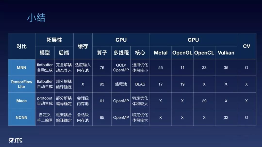 目前, MNN 在 CPU 上实现了 76 个算子, Metal 上有 55 个, OpenGL 覆盖了基础的 CNN 网络, OpenCL 和 Vulkan 分别有 29 和 31 个。