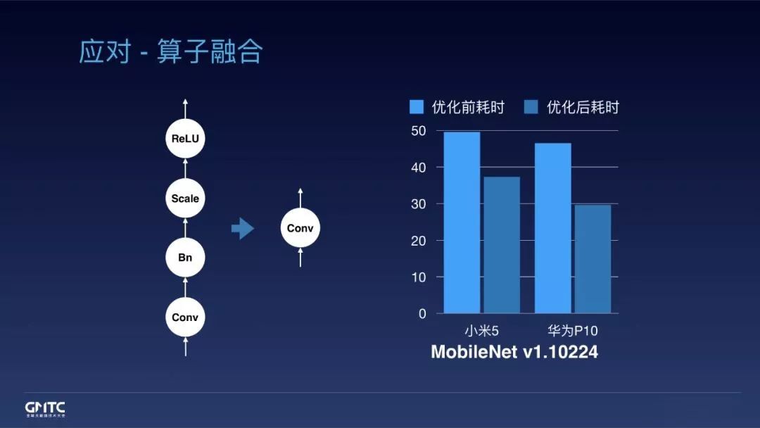 这样,四个算子就可以合并成一个算子。融合的过程避免了三次 tensor 读写、两次 tensor 乘加。优化效果:MobileNet V1 在小米 5 和华为 P10 上有 20 ~ 40% 的性能提升,效果还是比较明显的。