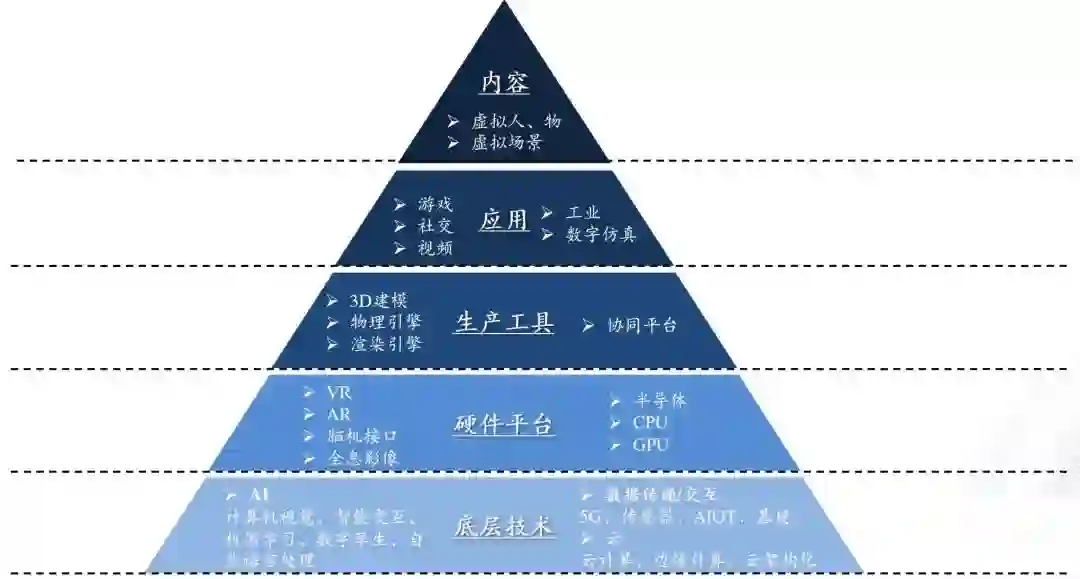 元宇宙概念实际上是技术进步由量变到质变的必然趋势。AI、音视频、芯片、大数据、VR/AR等等技术,都被综合利用,一起构成了元宇宙的技术基础。