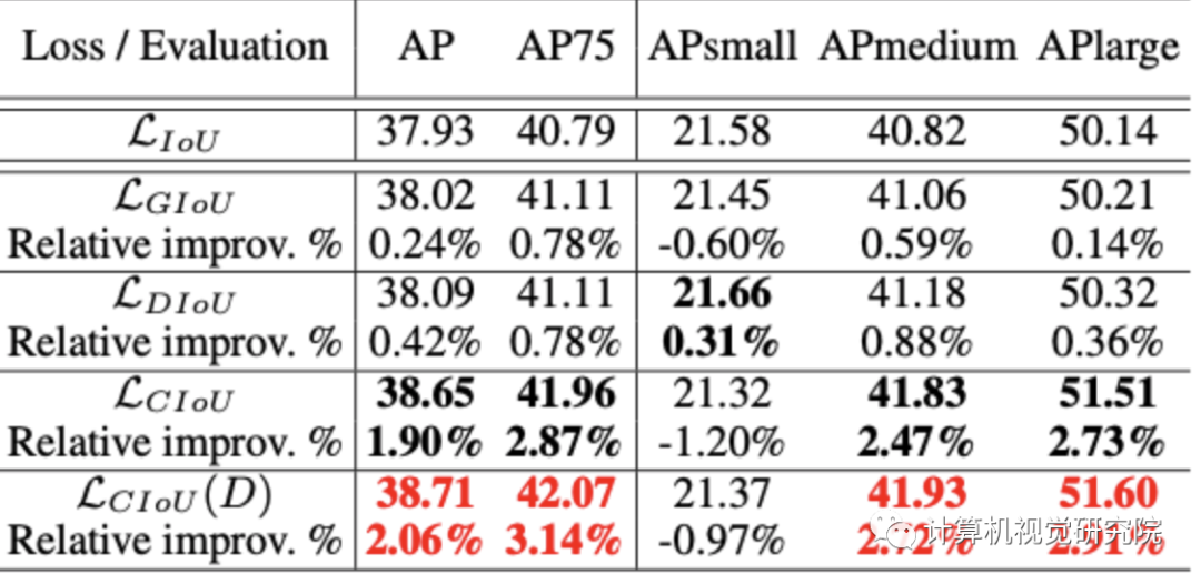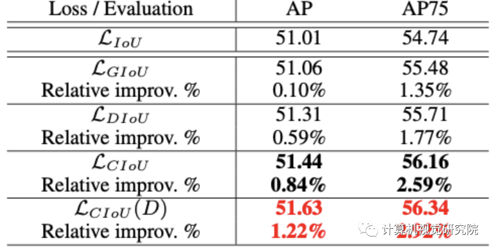 在Faster R-CNN ResNet-50-FPN上,由于Faster R-CNN本身提供的bbox质量都比较高,因此,GIoU的优化都很小,但此时DIoU和CIoU则表现了不错的优化效果。注意到,CIoU在小物体上的性能都有所下降,可能由于长宽比对小物体的检测贡献不大,因为此时中心点距离比aspect ratio更重要。