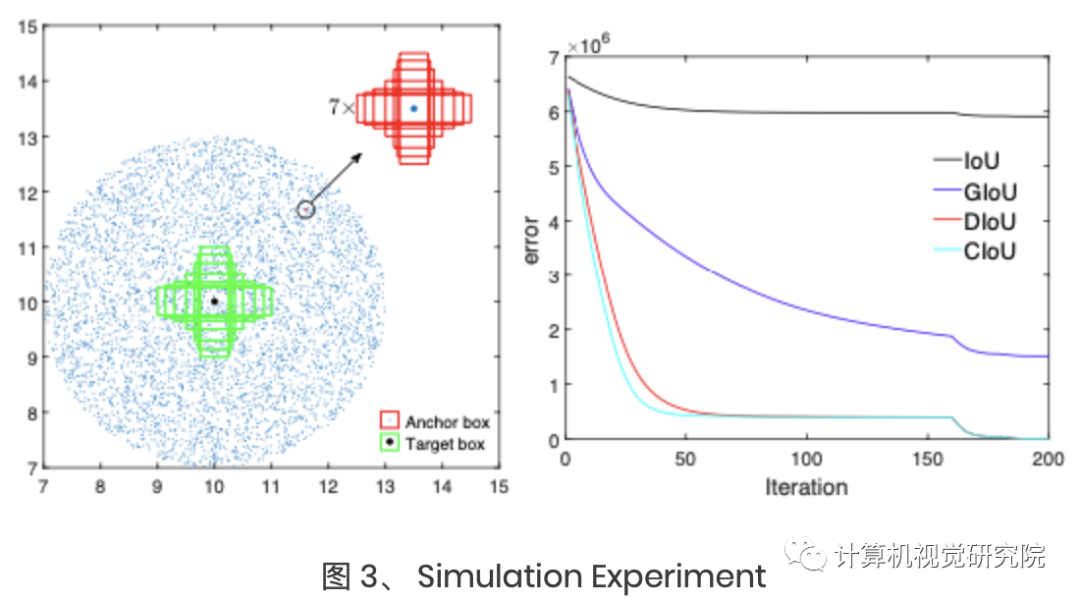 论文将5000个中心点上的bbox在最后阶段的total error进行了可视化。IoU loss只对与target box有交集的bbox有效,因为无交集的bbox的为0。而GIoU由于增加了惩罚函数,盆地区域明显增大,但是垂直和水平的区域依然保持着高错误率,这是由于GIoU的惩罚项经常很小甚至为0,导致训练需要更多的迭代来收敛。