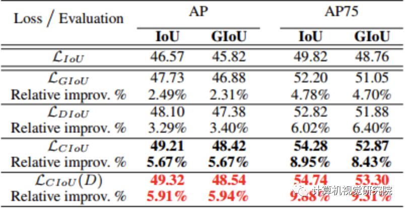 上图对GIoU和CIoU的结果进行了可视化,可以看到,在中大型物体检测上,CIoU的结果比GIoU要准确。