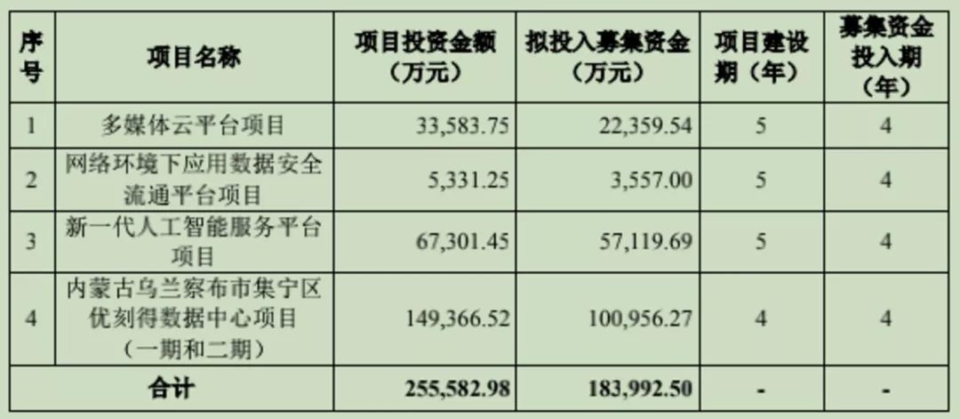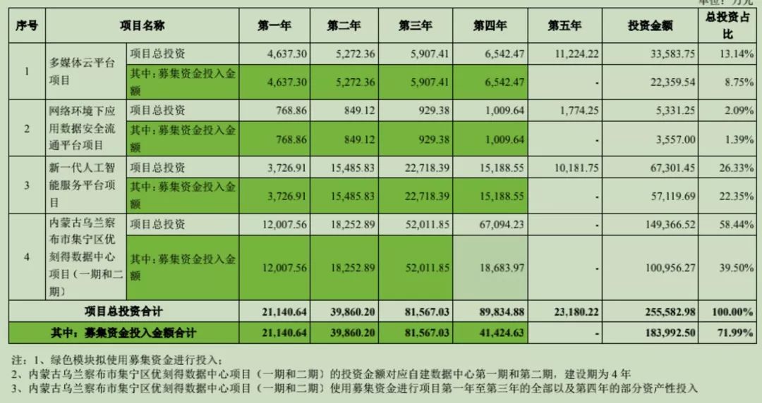 从上图我们可以看到,UCloud此次募集的资金基本用于了四年内基础设施的建设,其中总投资最高的是内蒙古乌兰察布数据中心,本次筹资额的39.50%将用于支撑该项目,在该项目进行的第五年,出现了明显的资金不足。