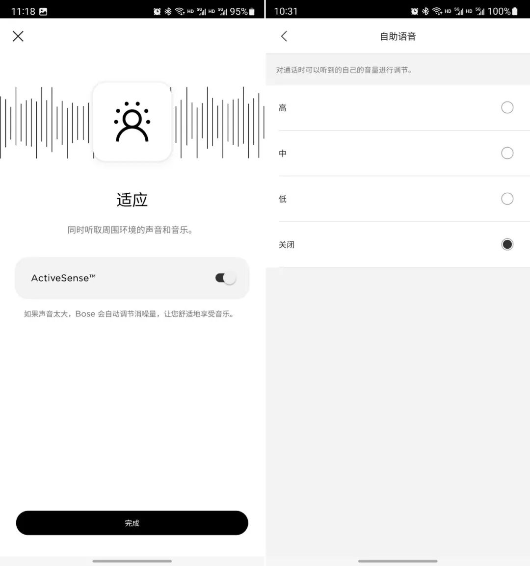 针对这个问题,BOSE 在配套应用中提供了一个名为「自助语音」音量调节的功能,提供关闭、低、中、高四档设置来对通话过程中自己的声音反馈效果进行调节。实际体验下来关闭和高两档之间有差别,但感知并不明显,关闭状态下能够听到的声音或许大部分来都源于骨传导,而将「自助语音」音量调到高之后,则能听出自己的声音里多了一点麦克风收音的塑料感。