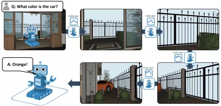 FAIR 提出了一项新的 AI 任务——具体化问答(Embodied Question Answering)。上图中在一个 3D 环境中的某个随机位置产生一个智能体,并给出一个问题(车是什么颜色的?)。为了回答这个问题,智能体必须借助智能导航以探索环境,通过第一人称(以自我为中心)的视觉收集信息,然后回答问题(橙色)。