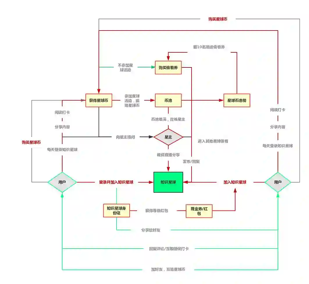 3、感觉你的产品结构的图并没有排上啥用场嘛,业务逻辑的图,可以增加一下「免费用户往付费用户转化、星球成员往星球主转化」的关系。