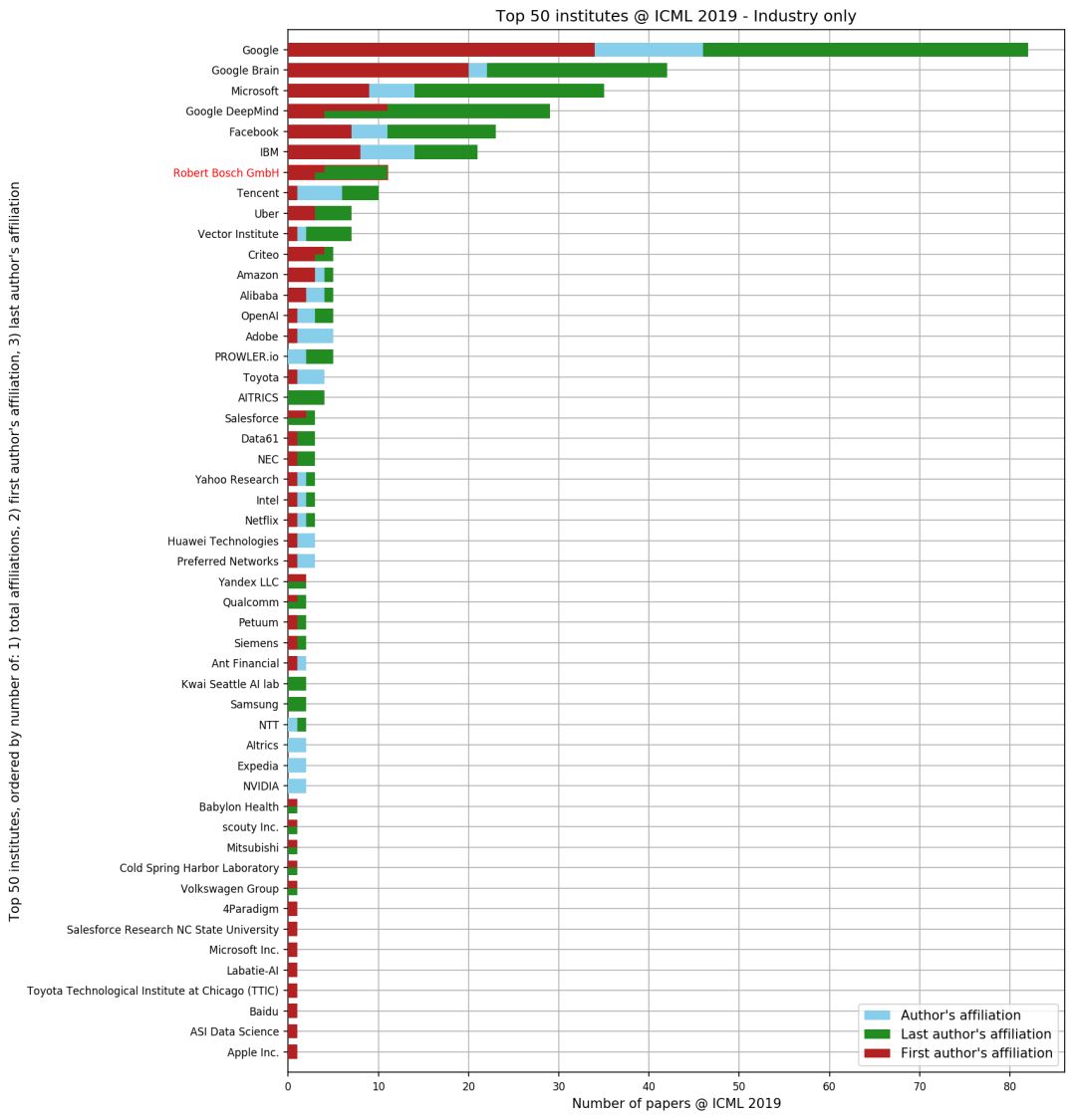 早在一个月前,Reddit上便有网友根据 ICML 2019 大会官网公布的接收论文情况进行统计( https://icml.cc/Conferences/2019/Schedule?type=Poster),总结了这次大会接收论文最多的机构、贡献最多的作者等。