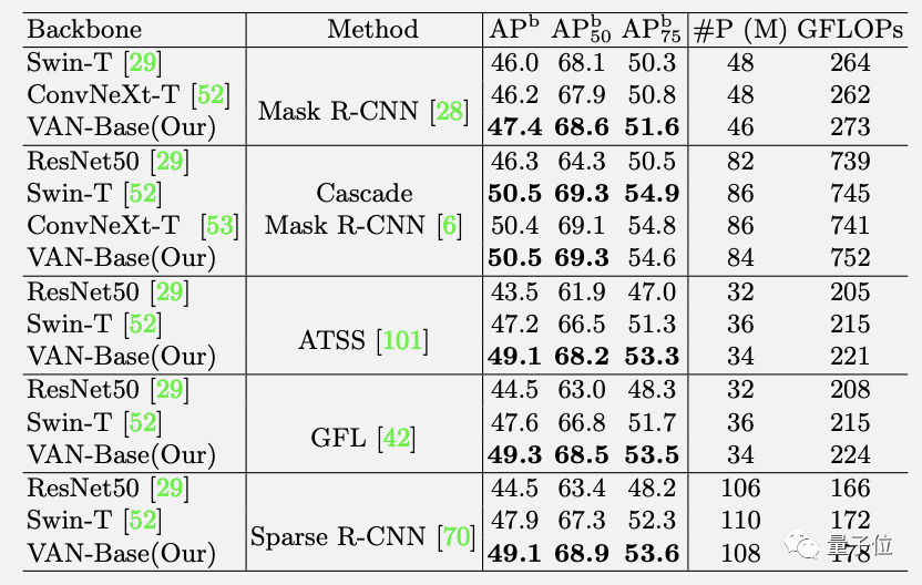 在COCO 2017目标检测任务上,以VAN为Backbone应用多种检测方法也都领先。