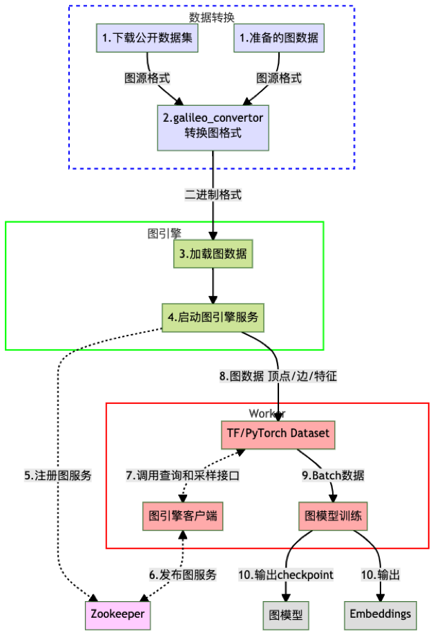 图2中不同颜色的框代表Galileo框架包含三种进程:图引擎进程(图中绿色框),训练节点worker进程(图中红色框)和Zookeeper进程(图中粉色框)。