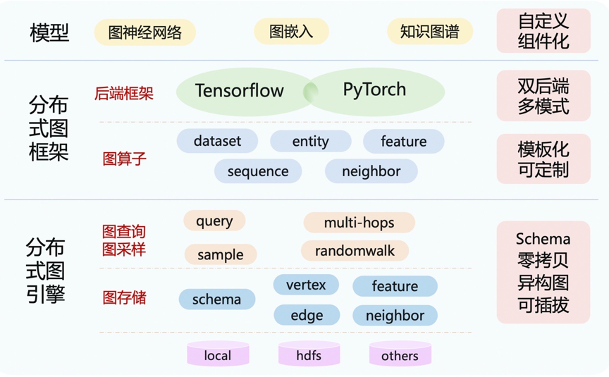 2.多后端分布式框架:支持Tensorflow和PyTorch双后端,配置化单机分布式训练,支持Keras和Estimator训练,提供统一的图查询和图采样接口,易扩展;