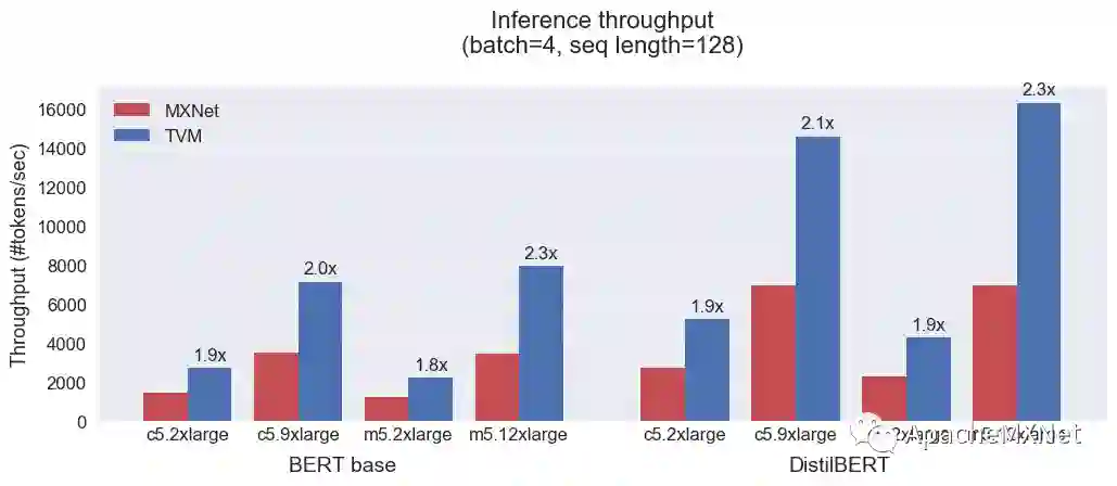 同时我们也在更多的EC2云服务器上(c5.2xlarge, c5.9xlarge, m5.2xlarge, m5.12xlarge)评测了BERT模型在batch 4和序列长度128下的吞吐量。下图显示TVM能够在各类型的服务器上将BERT和DistilBERT模型取得平均2倍更高的吞吐量。