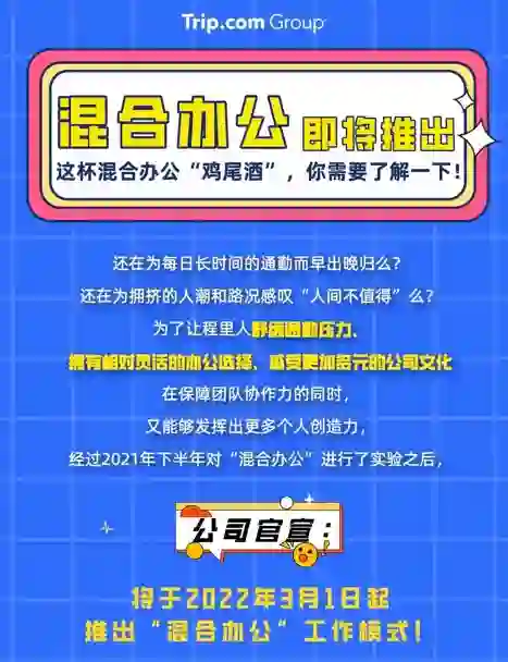 2月14日,携程送给员工一份情人节大礼:在不改变薪酬的情况下,自3月1日起,每周三、周五,公司各事业部、职能部门可根据实际管理需求,实行或逐步推行1—2天的混合办公制度。