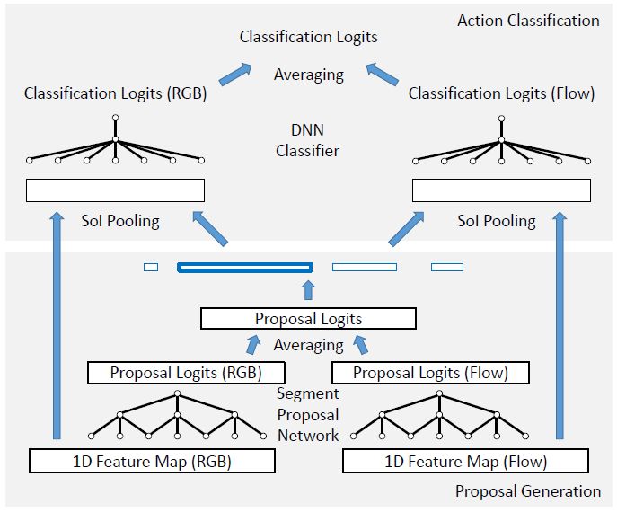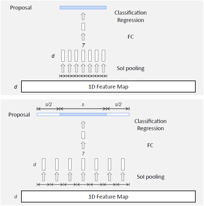 Faster R-CNN 很自然地被拓展到时序动作定位领域 [15, 9, 51]。回想一下,目标检测的目的是检测二维空间区域。而在时序动作定位中,目标则是检测一维的时序片段,每个片段都以一个开始时间和一个结束时间来表示。时序动作定位因此可以被看作是目标检测的一维版本。图 1(右)展示了一个典型的 Faster RCNN 时序动作定位流程。与目标检测类似,它包含两个阶段。首先,给定一组帧序列,我们通常通过二维或者三维卷积网络提取出一个一维特征图。之后,将该特征图传输给一维卷积网络(指候选片段网络,Segment Proposal Network),在每个时间点上对一组大小不同的 anchor 片段进行分类,并且对边界进行回归。这将返回一组稀疏的类别无关的候选片段。接着,对于每个候选片段,我们计算动作类别的概率,并进一步对片段边界进行回归(修正)。在这一步,首先使用一维的 RoI 池化层(也称「SoI 池化」),接着使用 DNN 分类器来实现。