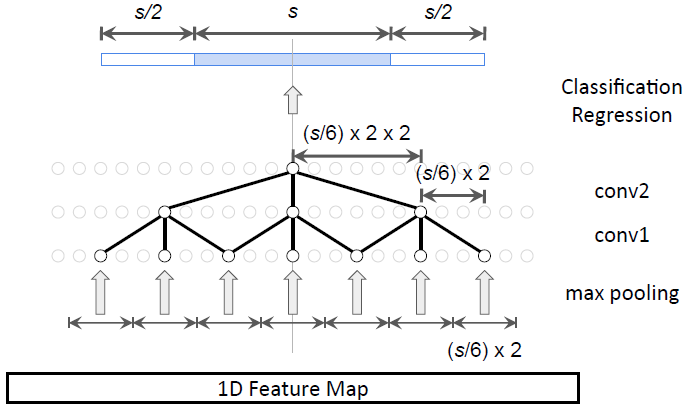 图 2:左图:在时序动作定位中,不同规模的 anchor 共享感受野的局限性。右图:本研究提出的的候选片段网络的 multi-tower 架构。每个 anchor 大小都有一个具备对齐后的感受野的相关网络。