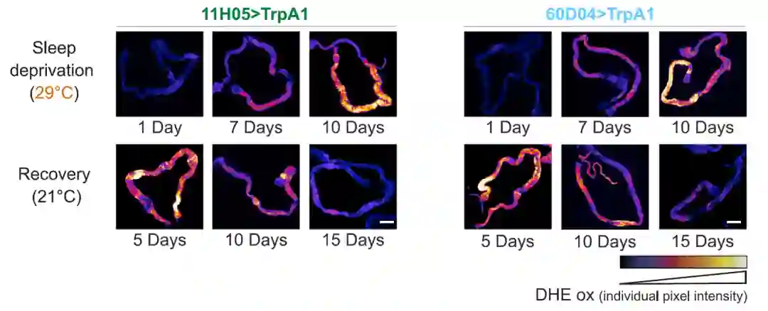 同时,研究人员还证实,氧化物的堆积和果蝇死亡率成正比,同样在第 10 天左右到达峰值,而且停止睡眠剥夺后,果蝇肠道内的活性氧化物水平也会降低。